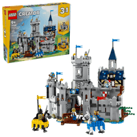 Introduce kids to fun medieval action with this LEGO Creator 3in1 Medieval Horse Knight Castle (31168) playset building toy. The detailed medieval castle toy opens at the back and is packed with cool features, including a movable drawbridge, great hall, stable, smithy, secret treasure chest, king's bedroom, writing room and 2 tower terraces.