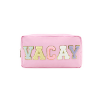 Discover stylish on-the-go organization this summer with an exclusive bag that tells everyone, "I'm in VACAY mode". This silky soft pink bag has soft pastel gold-trim chenille letters. Fill it with dozens of friendship bracelets, road trip snacks, craft supplies... you name it. A bright gold zipper keeps everything inside this 10" x 5.5" x 3.5" bag.